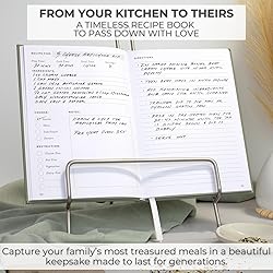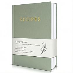 Your Unique Recipe Collection: The gorgeous recipe book for writing down your personal recipes is perfect for you to create & capture the secrets of your culinary delicacies in one place. They’ll be ready to pass on to future generations to be preserved endlessly Practical Template To Organize Your Favorite Recipes: From savory mains, yummy snacks to heavenly desserts, thanks to a simple layout it is very easy & fun for you to handwrite your recipes including time required, ingredients, diet restrictions, notes & directions Ample Space For Capturing Your Cooking Journey: Whether for new exciting cooking & baking ideas or for beloved family recipes - with 50 blank recipe book pages, ZICOTOs’ A5 recipe books (5.98x 8.5”) offer ample space for documenting all of your delicious recipes Clever Features For Max. Convenience: The blank cookbook features an ingredient conversion chart (cup to gram), an oven conversion chart (Fahrenheit, Celsius, gas) and - to find recipes easily & quickly - 2 ribbons & 2 index pages for adding a table of contents Beautifully Designed - Made To Last: The modern recipe notebook comes with a premium hard cover w/ a casebound binding in a lovely light sage green & gold foil lettering. Made of polyester waterproof cloth it not only looks fantastic, but is great for everyday kitchen use