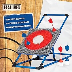 DUAL-FUNCTION FUN: The EastPoint 2-in-1 Axe Throw & Lawn Dart Game Set provides versatility with both axe throwing and outdoor dart board games. This set delivers entertainment during backyard gatherings and yard games for kids and adults ENDURING QUALITY: Featuring a robust 44-inch target constructed from durable plastic, this game set withstands vigorous play and varying outdoor conditions. The resilient construction ensures long-lasting backyard games for adults and kids SAFETY FIRST DESIGN: Equipped with foam and plastic axes, this game set prioritizes safety without compromising the thrill of ax throwing games. The soft foam axes reduce injury risk while maintaining the excitement, making it suitable for introducing kids to ax throwing INCLUSIVE GAMEPLAY: With six axes and four bristle lawn darts, multiple players can engage in friendly competition simultaneously. This comprehensive set enhances family yard games, offering a variety of activities and ensuring enjoyment for all ages and skill levels PORTABLE CONVENIENCE: Lightweight and easy to set up, this game set is ideal for outdoor yard games anytime, anywhere. Its compact design allows effortless transportation, making it a practical choice for picnics, camping trips, and spontaneous back yard fun