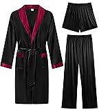 SWOMOG Men's 3 Pcs Robe Silk Satin Kimono Bathrobe with Shorts&Pants Set Lightweight Soft Sleepwear