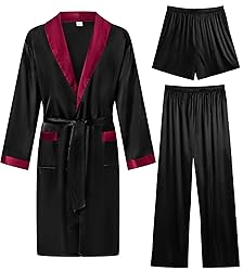 Premium Fabric: 3 PCS men's silk satin robe sets are made of 95% Polyester, 5% Spandex high-quality imitation silk fabric, which is lightweight, soft, breathable, smooth, and skin-friendly. Lightweight material with silky feel for a comfy night sleep Features: 3-piece Classical kimono shawl collar bathrobe with a gorgeous and classy look. Nicely tailored satin robe set includes a knee-length, long-sleeve robe with two front pockets, adjustable/removable belt, and inside ties; shorts&pants with soft elastic waist, easily put on and take off.Very comfortable for wearing around the house,lounging,and before/after spicy activities Suitable for All Seasons:Silky soft and comfy satin 3 pcs robe set is suitable for all-year-round wearing, perfect for bath, shower, loungewear, swim pool, hotel, vacation, party, wedding, sauna, spa, hot tub, gym, and leisure time.Perfect for mornings just waking up and not trying to find a shirt. 2 wearing styles can totally meet your needs throughout the year Ideal Gift: Exquisitely tailored with contrast piping collar, luxury, classy-looking robe set is a perfect gift for your family, boyfriend, friends, father, brothers, and husband on Birthdays, Halloween, Christmas, New Year, Father's day, and Valentine's Day Warm Tips: Hand wash or Gentle Machine wash, no bleach, no dryer, low iron heat. Please check the size chart before you order it. The manual measure may have 1-3mm error