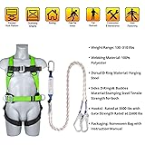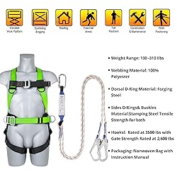 DATA:PLEASE READ BEFORE PURCHASING. Size(Including buckle)! Waist 30.7-47inch, Chest: 31.5-47.3inch, Leg: 21.2-38inch, fit weigh 130-310 pounds. Best for medium to large body, designed for construction & roofing work,not for rock climbing or hiking. SAFETY STANDARD:This full body construction harness is the perfect roofing harness specifically designed with premier fall arrest gear.We exceeded expectations by meeting and surpassing the requirements set forth in the ANSI/ASSE Z359.11-2014 standard.This complete fall protection package includes a 2m long safety lanyard and is also compatible with other types of lanyards.We offer unmatched safety harness fall protection!Safety is our number one priority! COMFORT PAD: Ergonomic, our new patented waist padding upgrades with thick premium ventilated breathable mesh plush pads minimize muscle fatigue.Increased air flow provides faster cooling and drying,providing additional comfort for the waist.Constructed with extra-wide support belt with premium plush padding for major support, soothing comfort and lateral movements.TRSMIMA harness for construction workers will never let you "down"! UPGRADE ACCESSORIES:Our 4 point adjustment full body harness is international version which is signed according to the highest standards in world.It adds many safe and practical accessories: this harness has as many as 4 adjustm-ent points; shoulder load-bearing loops allow you to enhance suspension protection in tight spaces; the waist of the harness has durable side D-rings can be used in work positioning to and store more spare hooks! OSHA COMPLIANT – Tips: No need to break the sealed package, it will pop open automatically when used.TRSMIMA ensures the safety and well-being of workers through setting standards and offering training, outreach, education, and assistance. Great for use in Construction, Demolition, Climbing, Hunting, Roofing, Emergency, First responder, Landscaping, Security and etc.