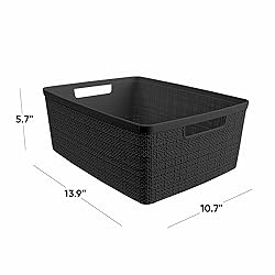 - Keep your home organized in style with the Curver Jute medium decorative plastic storage basket. A stylish storage solution that features the look of handcrafted woven textures in an easy to maintain resin material, the perfect alternative to wicker baskets. This decorative storage basket is perfect for any room, matches with any décor style and is ideal for use in open spaces such as shelving or table surfaces.