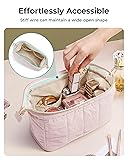 【CONVENIENT DESIGN】- The wide opening design of this makeup bag allows for effortless access to all your beauty essentials. Say goodbye to wasting time searching through tiny cosmetic bags. With this women's toiletry bag, you can quickly find your desired cosmetics like lipstick or eyeshadow 【SPACIOUS CAPACITY】- With dimensions of 9x4.5x5.8 inches, this travel toiletry bag offers ample space for all your belongings. Inside, you'll find three handy pockets. Two of these pockets are specifically designed to securely hold smaller items such as lipsticks, eyeliners, tweezers, or travel essentials. The third pocket, made with PVC liner, is generously sized to accommodate your makeup brushes, powder puffs, and other travel accessories 【EASY-CLEAN POCKET】- This well-crafted make up bag features dirt-proof pockets with PVC lining to hold your makeup brushes.Travel cosmetic bags for women ensure that your skin care and beauty products remain protected and spill-proof. Perfect for women who are always on the go 【Sophistication with Comfort】- Made from soft and luxurious taslan fabric, this cute and puffy makeup bag showcases a laid-back vibe that effortlessly complements your beauty routine. The supple texture of cosmetic case adds an element of relaxation to your daily rituals, allowing you to unwind and enjoy the process of getting ready 【MULTI-FUNCTIONAL】- This versatile toiletry bag can serve as a travel essential, a daily purse organizer, a makeup pouch, a tech accessories bag, or a travel accessories bag. It also makes a fantastic gift choice for occasions such as Christmas, birthdays, or Valentine's Day. Its elegant design and practicality make it the ultimate gift for any woman, whether it's your friend, family member, or BFF