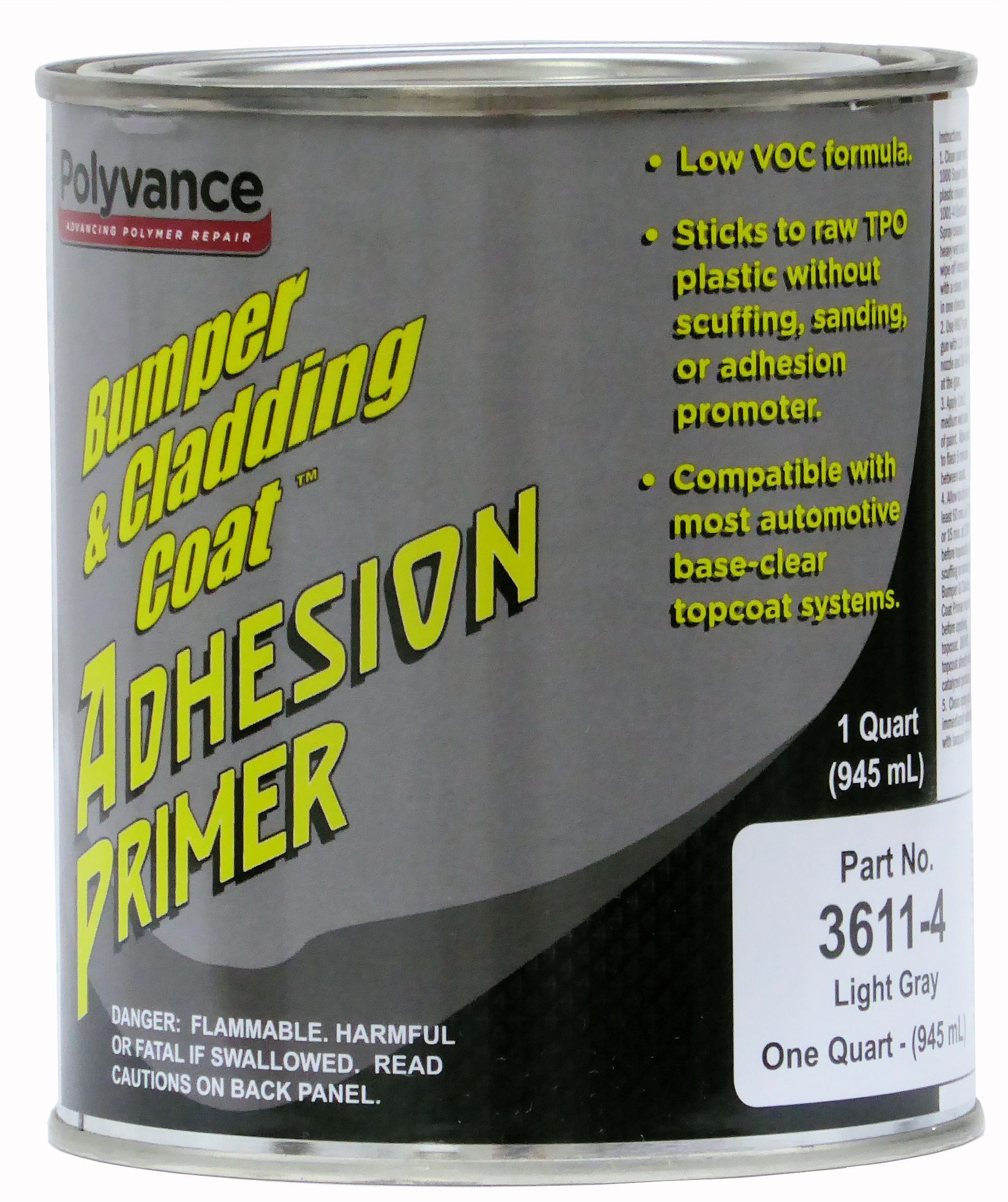 - Urethane Supply Co. Polyvance Bumper Cladding Coat 3612A Low VOC Adhesion Primer, 11 oz Aerosol Can, Dark Gray, Liquid. Bumper Cladding Coat Adhesion Primer is an advanced, lowVOC, solventbased, nonsand able primer that is designed to stick to problem plastics like TEO, TPO and PP without sanding or pretreatment. The URE3612A is a reliable and highquality product designed to deliver consistent performance across a range of applications. Engineered with durability and ease of use in mind, it ensures efficiency and longlasting results for both professionals and hobbyists. Features. Sticks to smooth or textured TPO, TEO, and Polypropylene plastics. May be top coated with most solvent or waterborne base/clear topcoats and single stage systems without sanding. Low VOC formula sprays smoother and has improved topcoat compatibility over the previous formula. No close on the window for top coating. Legal in all 50 states and Canada. Convenient aerosol can means there is no waste and no clean up. No need to clean, sand, sweat, reclean, and so on. Built with durable materials for longterm performance. Designed to enhance productivity and ease of use. Suitable for both professional and everyday applicationsSpecifications. Container Size oz 11. Color Dark Gray. Form Liquid. Weight 0.9 lbs