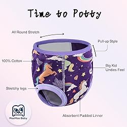 Cotton Potty Training Underwear: Made from soft,organic cotton, moomoo baby training pants are comfortable to wear and keen to sensitive skin. They can be washed and reused multiple times, making them more cost-effective in the long run Strong Urine Absorption: MooMoo Baby training underwear features thick padded layers with strong urine absorption. Designed to contain small accidents, these underwear are a must-have for any family navigating the potty training process. It is recommended to wash in water before wearing to maximize its effectiveness Stretch Waistband:The elastic waistband helps to keep the training underpants in place, preventing accidents and offering a secure, comfortable fit. Plus, the stretchy material makes it easy for baby to take the underwear on and off by themselves, promoting independence and self-confidence Care Instruction:Our boys and girls training underwear is machine washable. To ensure the best results, we recommend washing the underwear separately or only with other cotton fabric. To preserve the quality of the materials, we suggest washing on a delicate cycle and avoiding harsh detergents. For best results, hand dry or use a gentle tumble dry setting to dry the underwear. Please DO NOT use bleach or dry clean the underwear, as this can damage the materials and affect the absorbency Size for Potty Training Pants: 2T (waist 13.4 in, height 33.5 in, weight 24.3-26.5 lbs); 3T (waist 14.2 in, height 37.4 in, weight 26.5-32 lbs); 4T (waist 15 in, height 42 in, weight 32-36 lbs); 5T (waist 15.8 inches,height 46 in, weight 36-40 lbs); 6T (waist 16.6 inches,height 50 in, weight40-44 lbs); 7 Years=7T (waist 17.4 inches,height 54 in, weight44-48 lbs); 8 Years=8T (waist 18.2 inches,height 58 in, weight48-52 lbs)