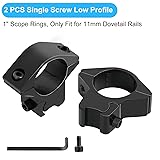 ✌【Perfect 1" Scope Rings For 11mm Dovetail Rails】LONSEL 4 set of different heights 1'' scope mount rings include 2 Pcs Medium Profile + 2 Pcs High Profile in one package. These scope rings fit for 3/8'' or 11mm dovetail rails, perfect for mounting most scopes which are In 1''/ 25.4mm scope tube. Available in two styles, A must have scope rings for hunting shooting! ✌【4 Set Of Two Styles 1'' Scope Rings】2 Pcs Medium Profile: 0.55'' gap from base of mount to bottom of ring, Item Height 1.77'', Dimension 1.61*1.77*0.83 Inch, Weight 1.55 Oz per ring; 2 Pcs High Profile: 0.82'' gap from base of mount to bottom of ring, Item Height 2'', Dimension 1.61*2.0*0.83 Inch, Weight 1.83 Oz per ring. ✌【Built-In Tape Protection & With Stop-Pin Design】 Built-in tape inside per rings to prevent from marring the scope, also prevent sliding and holding postion accurately. One of the high rings and one of the medium rings have a stop pin the bottom, Which prevents the ring from sliding once set. ✌【High Quality Aluminum, Solid & Durable】Precision machining of aircraft grade 6061 aluminum alloy + high strength steel in black matte anodizing finish. Sturdy & lightweight construction, build no wobble, offer durable safe performance in the field. ✌【Rail Clamp Screw Design & Easy To Install】With 2 rail clamp screws and 4 scope clamp screws per side, ensure mount any 1'' scope firmly, just twist on/off the rail clamp screw nut via allen wrench and mount the base on 11mm dovetail rail, simple and quick to remove or install. Comes with 2 pcs allen wrench.