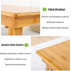 - Specifications Material: Natural bamboo Color: Wooden yellow Size: optional Features -No assembly required -Foldable table legs -Easy to store and space saving -Multipurpose -Desktop waterproof, without burrs -Smooth table corners -Strong load-bearing capacity Please note 1. Press the latch next to the table leg and press down on the table leg to fold it. 2. The product size is measured manually, and there may be slight errors. Please do not mind. 3. Due to differences in screen display and shooting environment, there may be slight differences in color.