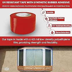 Robust Composition: Featuring a 7.0 mil (0.178mm) total thickness, our tape is made with a 4.5 mil low-density polyethylene film, providing strength and flexibility. The film is expertly coated on one side with a high-grade synthetic rubber adhesive, ensuring strong and durable adhesion. UV-Resistant Backing: The tape's backing is fortified with special additives, making it resistant to the deteriorating effects of UV exposure. This unique stabilization means the tape remains effective and intact even when used in outdoor settings or under prolonged sunlight. No-Residue Removal: Engineered for hassle-free removal, the tape leaves no sticky residue on most surfaces. It's essential to perform a preliminary test on the intended surface to confirm compatibility, ensuring a clean removal process without damaging the surface. All-Weather Reliability: This tape maintains a water-tight seal in various weather conditions. Its premium adhesive system stays permanently tacky, creating a reliable bond that withstands a wide range of temperatures, making it a versatile choice for different environmental conditions. Versatile Applications: Primarily designed for masking windows and doors in stucco applications, this tape is also ideal for splicing or seaming polyethylene in construction projects. Its strong adhesive and flexible backing make it suitable for a variety of construction and repair tasks.