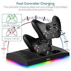 【6 in 1 Stand for XBOX SERIES S】: Vertical stand for Xbox Series S Console, built-in 2 fans for Xbox Series S Console, dual charger for 2 Xbox Series S Controllers,15 Colorfu l Light Modes, Earphone bracket,two 1400mAH battery packs,extra USB port.Good accessories in daily games, holiday presents are preferred.(NOT FOR XBOX ONE S, ONLY FOR XBOX SERIES S) 【15 RGB Light Modes for XBOX】: There are 15 RGB bottom light effects - 7 monochrome light effects, 8 running lights and blinking effects, multiple light modes for you to choose from. Light memory effect will automatically save the current light mode and turn off when long press 3s, and enter the light mode before power off when power on again. You can adjust the light mode according to your preferences, adding colorful and cool lights to your room to increase the atmosphere of the game. 【Dual Cooling Fan System for Console】: Designed with the dual cooling fan at the bottom can accelerate the air circulation inside the console system to cool it better. Have power button for turning the fans ON/OFF, The button can control the fan operation at any time. The metal base also can effectively cool for Xbox Series S console, which improve the operational life span. Anti-slip rubber bottom design will keep the vertical stand tightly and stable. 【Dual Charger with 2 * 1400MAH Batteries】: Type C ports are set up to charge 2 controllers for xbox series s controllers, it can fully charge controller in 3 hours. When the controller is fully charged or in standby mode, LED a green light is shown, when it is charging a red light is shown, so you can clearly see the charging status.The charging dock only be used for the equipped with 2 * 1400MAH batteries or XBS / XBX original battery, please do not use this stand to charge other battery pack. 【Excellent Space Management for Gamer】: By holding them in a vertical position, the stand minimizes the space taken up for Xbox Series S console and controllers, headset and keeps the gaming area neat. And the USB charging cable can charge the battery pack directly. Extended USB port doesn’t support data transmission. Charger will stop working when console off, but the sleep mode can charge. A multi-functional package that meets your basic needs and enhances your gaming experience.