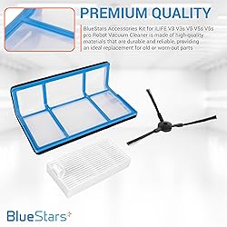 PACKAGE INCLUDED: 1 x Primary Filter, 3 x HEPA Filter, 6 x Side Brush ENSURE THE BEST CLEANING RESULTS: The 3 side brushes are specially engineered to reach and clean corners and edges, ensuring spotless every nook and cranny. FILTER 99% OF THE SMALL PARTICLES: The high-efficiency Primary Filter and HEPA Pro Robot Vacuum Cleaner Filters are designed to capture fine dust also small particles, ensuring the air in your home remains clean and fresh. GENTLE ON HARD FLOOR: BlueStars Accessories Kit for ILIFE V3 V3s V5 V5s V5s pro Robot Vacuum Cleaner is designed to be gentle on your floors, preventing scratches or other damage. The innovative design also helps reduce vacuum noise, providing a peaceful cleaning experience for you and your family. IDEAL REPLACEMENT: BlueStars Accessories Kit is compatible with ILIFE V3s V5 V5s V5s pro Robot Vacuum Cleaner. Therefore we recommend checking your side brush and filter every 3-6 months and replacing it if needed. If you are using your vacuum on a daily basis you will need to replace the brush roll much more frequently.
