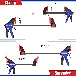 6" Clamps Set: The set contains 4 pieces 6" light-duty clamps and 2 pieces 6" mini clamps. The 6" light-duty clamps can be set to spreaders of sizes up to 11-1/4" and the 6" mini clamp is also a spreader with sizes up to 9-1/2". Clamp & Spreader: The unique quick-change button design allows the f clamp to be a spreader as well. Just press the red button to take the jaw off and then reverse it before putting it back in, you will get the spreader you need. Quick Release: The quick-release trigger is a convenient tool, especially when frequent adjustments to the clamping position are needed or when quick removal or clamping of workpieces is required, catering to various workpiece needs. It simplifies operation and can be easily manipulated with just one hand. Powerful Clamping Force: The light-duty clamps have a clamping force of 150 lbs, lightweight but sturdy enough to withstand the pressure for a long time. The mini clamps have a clamping force of 50 lbs, perfect for clamping fine workpieces, such as small parts in modeling or detailed parts in precision woodworking projects. Solid Construction: The reinforced nylon body and high-quality hardened steel bars provide excellent impact resistance, allowing it to perform on construction sites. This design not only ensures the endurance of the clamp but also enhances its loading capacity and stability.