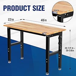 Exceptional Strength and Stability: Constructed from robust 1 mm steel, this garage workbench endures extensive testing at 1500 lbs, ensuring unmatched strength and stability. With a reliable load capacity of 1500 lbs, it guarantees unwavering support for your projects, making it the ideal choice for heavy-duty tasks Premium and Sustainable Materials: FSC-certified solid wood rubber tabletop (1in thick) ensure comfort and safety under heavy loads. 48in by 22in tabletop offers ample room for projects and tools. Utilizing transparent coating enhances durability for a longer product lifespan. Choice with responsible wood sourcing for environmental conservation and ethical practices Tailored to Your Comfort: Achieve the perfect working height with the adjustable height feature of our work desk. With a height adjustment ranging from 30-1/2" to 39-3/8" (5 different height settings), you can customize the workbench to your preferred ergonomic position, ensuring optimal comfort and reduce strain during extended work sessions Power Up Your Productivity: Equipped with an ETL Certification Power Strip, WORKPRO garage workbench offers convenience and efficiency at your fingertips. The power strip features 4 AC outlets and 2 USB-A ports, allowing you to effortlessly connect and power your tools, devices, and accessories Effortless Assembly: Designed for hassle-free installation, this workbench for garage comes with straightforward instructions and all necessary hardware, making setup quick and convenient. Our expert customer service team is ready to assist with any workbench issues Versatile and Practical Design: WORKPRO 48" adjustable workbench is a versatile tool that adapts seamlessly to various usage scenarios, such as workshop, garage or kitchen. Its heavy-duty steel frame not only ensures durability and stability but also enhances its industrial aesthetic. Besides, the adjustable leveling feet provide a sturdy and balanced work surface, even on uneven floors
