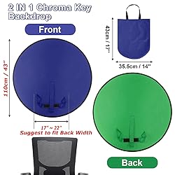 2 In 1 Blue & Green Screen on Same Backdrop: this double-sided blue and green 2 in 1 chroma key background is great for covering out the real background and completing background replacement through post-processing, idea for chroma keying, live streaming, photo and video shooting. Easy to Use: the blue backdrop with hook & loop straps can be easily attached to your chair with back-rest and easily removed when not in use. No additional brackets are required and is recommended for use with chairs. (Chair NOT Included) Size Information: this round photography backdrop is approximately 43 in / 110 cm diameter when unfolded, perfect for covering smaller backgrounds or photographing smaller projects. Double-sided different color designs are suitable for personal and small studio use. (NOTE: One side in Blue screen and the other side in Green screen on same backdrop) Portable & Foldable: the green screen backdrop features a collapsible design, can be easily folded and stored into the included carry bag to save space. The portable design makes it perfect for travel and outdoor photography. Durable and Reusable: made of quality polyester fabric and steel ring, the blue screen background is lightweight, durable and won't wrinkle easily after repeated use. With a even and bright color help to easily identify in post-processing.