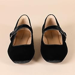 COMFORT AND FIT: These mary jane ballet flats have a padded insole with high-quality memory foam for added comfort and a heel pillow to relieve pressure and heel slip MATERIAL: Amazon Essentials shoes are made from high-quality materials. This style has a faux suede upper, and is lined in faux suede with a leather heel lining STYLE: These mary jane ballet flats have rhinestone detailing, an adjustable strap with elevated metal buckle, a soft square toe and a modern upper design DETAILS: 1/4 inch heel with a flexible non-slip sole
