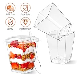 - Delicious desserts are essential for wedding, birthday party, baby shower and any other events! Our 25 pack 5oz dessert cups with lids and spoons will satisfy your daily use and party use. Premium Material These clear desert cups are made of high quality PS plastic, crystal clear, BPA free, sturdy and freeze safe. You can wash and stack them up for later use. Great Combination The package includes 25 pcs clear dessert cups, 25 pcs clear lids and 25 pcs clear spoons. The secure lids can keep desserts fresh, ensure the safety of desserts in transit. Versatile Use Our 5 oz dessert cups are ideal for displaying delicious appetizers, banana puddings, mousses, sorbets, fruit, jello, yogurt, etc. Specification: Color: clear Material: PS Quantity: 25 pcs Size: 5oz Package Includes: 25 pcs clear dessert cups 25 pcs clear lids 25 pcs clear spoons Whether Birthday party, wedding, baby shower, bridal shower, family gathering or any other events, our clear dessert cups are sure to brighten up your party.