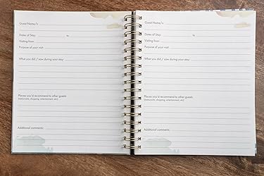 - Welcome and delight your guests at your relaxing vacation home! Allow your guests to leave their review and recommendations behind for the next guests! Let your guests share their memorable stories with future travelers & live vicariously through the words of the travelers before them. Hardcover spiral binding book with a glossy finish for a professional look and feel and will only add to your getaway rental decor. Convenient 7.5x9" size - giving your guests ample space for writing their story 200 guest pages, on quality off white colored interior paper included in every rental Welcome Book. Each guest has a front and back page to fill out, giving them amble room to leave detailed descriptions. Front of each page has: Guest's name, Dates of stay, Visiting from, Purpose of your visit, What you did / saw during your stay, Places you’d recommend to other guests (restaurants, shopping, entertainment, etc.). On the back of each page is a lined page for "Additional Comments" Having a guestbook can allow you to understand your guests a little more, and helps future guests get ideas on things to do around the area! Perfect for beach houses, cabins, hotels, rentals, airbnbs, investment properties, etc.