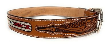 - This is 1.5 inch wide genuine leather western style belt. Tulip decorated on both ends of the belt and a nice western design in the middle. Buckle is removable. White stitching on the sides. Belt size is NOT the same as pants size.... belt size should be at least one size bigger than the pants size as the belt is going over the pants and shirt. For example if you use a size 36 pants go with a size 38 belt. To accurately order a belt please measure your current belt to the notch you use it on ( do not include buckle ). If it measures 36 inches to the notch you use it on go with a size 36.