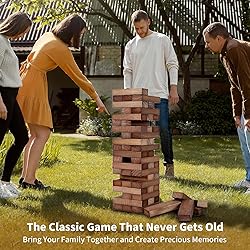 - ApudArmis Giant Tumble Tower Stack up to 5Ft: for Teens Adults Family. This Stacking Timbers Set is an addictive game , offering hours of outdoor entertainment for your Families,Friends,Colleagues. Why Choose ApudArmis Giant Tumble Tower Set? Offer Hours of Entertainment ➤The Classic Wood Stacking Games is a perfect gift for your Friends, teens, Parents. Great group indoor or outdoor game for Pub, Parties, BBQ's, Tailgating, Group Events, Wedding, Camping and much more. Superior Quality Pinewood ➤ApudArmis Blocks are made from hand picked premium pine hardwood, which is NON-Toxic, No Splitting, No Cracking and provides long-lasting durability. The Block corner edges are meticulously rounded and extra smooth, which make it safe for your Teens and family. Accumulate Up to 5 Ft Tall ➤The Giant Tumble Tower Set comes with 56 pcs Tumble Blocks.The Stacking Games bring family challenge and fun, starting out at 2.37 FT tall and can be grown up to 5 FT tall tower when played. Easy to Play ➤Our Giant Timber Game is easily for Teens, teenager, adult and the older to play, including Teens, Adults, Family. Parents can get timber for Back Yard fun. It’s the best family activity spans the age gap. Storage Bag for Easy Transport ➤This Wooden Blocks Games Set come with a handy zippered quality carrying case, allowing you to hold all of the Timber Stacking into it. You can take the Huge Tumble Tower Game Set anywhere A Fun and Skillful Game Set ➤This amazing giant wooden tower block can also help you develop good motor skills, improve hand-eye coordination, enhance balance, become more patient and gain excellent self-control. What's In The Box? - 54+2 Pcs x Tumble Blocks - 1 x Pinewood Dice - 1 x White Scoreboard - 1 x Zipper Bag - 1 x Guideline Instruction