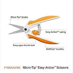 ARTS AND CRAFTS STAPLE: Fiskars Easy Action Micro-Tip Scissors (No. 5) are perfect for cutting details out of fabric including silk, oil cloth, polyester, cotton, crepe, felt, and more PRECISION ART SUPPLIES: Micro-Tip blades provide unmatched cutting precision, especially on intricate details and tight patterns LONG LASTING AND RELIABLE: High-grade, precision-ground stainless steel blades stay sharp longer and cut all the way to the tip; Fiskars craft supplies and materials are built to last COMFORTABLE AND CONVENIENT: Easy Action spring-assisted handle gently opens after each cut to help reduce hand fatigue; Easy-open thumb lock provides safe storage and transportation; The SoftGrip handle enhances comfort and control QUALITY TOOLS FOR ARTS AND CRAFTS: From scissors and cutting mats, rotary and paper cutters, to classroom essentials, scissors for kids, and quilting and scrapbooking supplies, Fiskars crafting tools are designed to help you do what you do best: express yourself INCLUDES: 1 pair Fiskars Micro-Tip Easy Action Scissors; Full lifetime warranty
