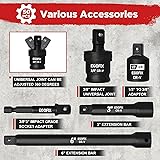 【Material Processing】: This 50-piece SAE/metric socket set is made of Chrome Vanadium steel (CR-V), featuring a black phosphoric acid coating on each socket surface to enhance durability and corrosion resistance. Each socket is marked with highly visible engravings, ensuring easy identification even in low-light conditions. 【Detail size】: The 50pcs 3/8" socket set includes 28PCS Deep/Shallow metric socket: 8, 9, 10, 11, 12, 13, 14, 15, 16, 17, 18, 19, 20, 21, 22mm; 16PCS SAE socket: 5/16", 3/8’, 7/16", 1/2", 9/16", 5/8", 11/16", 3/4"; 2PCS extension bar: 3", 6”; 3/8" 72-teeth ratchet handle, 3/8” impact universal joint, 1/2” to 3/8” socket adapter, 3/8" impact grade socket adapter and hex to 1/4" square drill socket adapter. 【6-Point Socket Design】: This mechanics tool set features a 6-point flank drive design that provides a secure grip on fasteners while preventing damage to their corners, effectively minimizing the risk of rounding. It comes with 3" and 6" extension bars, plus a 3/8" impact universal joint that allows access to confined spaces and flexible angle adjustments. The complete set saves time and labor costs, delivering exceptional working efficiency. 【Organized Storage】: Comes with a Wear-resistant tool box, all sockets are neatly fixed in the box for easy carrying, transportation, safe storage, and quick organization that make you take your set anywhere to meet your job requirements. 【Widely Use】: This deep socket set is ideal choice for any Home maintenance, Garage and Automobile repair, DIY home improvement. Also this tool set is value gift for men on various occasions like Father's Day, Birthday or anniversary.