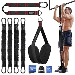 - [Convenient for different age, shapes and Height]This pull up assistance bands include a adjustable length straps that you can adjust the length to match your body height, with two footrest,You can practice by either standing or kneel on the pull up machine. Ideal home workout equipment for both men and women. This is an excellent device for adding those reps safely. This pull up bands assistance bands will help you train to do pull ups correctly and get stronger as you progress. these resistance bands for pull ups assist is the must-have addition to your at home pull up bar routine. [Tailored pull up bands for fitness Pros & Beginners]It comes with 4 pull up resistance bands, multiple resistance values, you can scale from 55lb to 260lb of assistance. Whether you're a beginner or advanced, these assisted pull up bands adapt to your strength level. If you have a hard time getting chin-ups,it Allows you perform pull-ups independently, completely and correctly without any help. And if you're advanced,this pull up straps assist will help you to add additional umph after your muscles fatigue. Easy to switch bands to increase or lower resistance. non-slip foot stirrup gives support for the trainer while doing pull up or chin up.[Target multiple upper body & core muscles]it's time to use our pull up bar bands assistance bands for adults and youngsters. This pull up assistance bands specifically designed for exercising and burning calorie, maintain the figure, promote fat burning, strengthen the body, and improve blood circulation. pullup bands can give you an easy and efficient training time. Through the pull-ups, chin up, high-level metabolic exercises, effectively training to build muscles in the chest, arms, back, abs and core. Elevate your workouts with the indispensable pull up resistance bands set.Specification:Material: Natural Latex Resistance Bands+ Heavy Duty Steel Carabiners+ Durable Nylon Straps + Double metal rings+ Durable nylon sleeveBearing capacity: 220 lb.Color: Blue& Red & Yellow Target multiple upper body & core muscles-7-piece pull up assistance bands set-1 Adjustable-length straps-1 comfort padding footrests-4 stackable latex resistance bands of 65lb (up to 260lb)