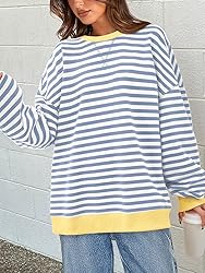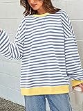 Size Guide: S=US 4-6, M=US 8-10,L=US 12-14,XL=US 16-18, XXL=US 20. Dressing Tips: It runs ture to size, please size up if you are looking for an oversized fit looks like the picture. FLOWING FABRIC: 95%Cotton+5%Elastane-Soft and comfortable oversized sweatshirt for women trendy 2026; This striped womens sweatshirt with stitch detailing is made of premium material to give you the maximum comfort, it is super soft, stretchy and skin-friendly, suitable for spring, summer and autumn. FEATURES: Oversized sweatshirt for women girls/Striped sweatshirts for women/Color block womens sweatshirt/Casual crewneck sweatshirts women/Stitch v neck detailing/Long sleeve sweatshirt women/Drop shoulder shirt top/Contrasting hem/Loose fit sweatshirts for teen girls. The vibrant color striped sweatshirts for women loose fit no hood could make a nice addition to your wardrobe. HIGHLIGHTS: Our pullover sweatshirts for women trendy feature cute striped design, great summery colors and stylish stitch detailing. The vibrant stripes takes this oversized crewneck sweatshirts women up a notch and the loose fit womens sweatshirt can fit any shape. This cotton blend casual long sleeve sweatshirt women is not easy to wrinkle or go out of shape. A must-have for anyone wanting to stay on-trend with comfort. MATCH:This crew neck sweatshirts women is easy to pair with casual pants, jeans, joggers, shorts, leggings, sneaker, casual shoes to creating a chic and pretty looking in spring, Fall and winter. You can also match anything you like inside, tank top, crop top, vest, etc.