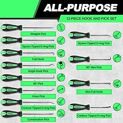Premium Quality - Made of heat treated CR-V steel and chrome vanadium steel shafts, sturdy and sharp. Ergonomic Grip - Non-slip rubber handle assuring precision control, help with precise work like jewelry hand making. Multi-Use - Heavy Duty Hook Set has 6 shapes for pulling clips rings wires gaskets washers and other small parts and 4pcs o-ring pick set ,the rounded tips with blended edges come in handy for easy removal of seals and O-rings. Includes 12pcs - hook, 90-degree hook, 45-degree hook, double angle hook, complex hook, angle hook .4pcs o-ring pick set. Application-This pick and hook kit is used for ignition system, intake valve,seals, rifle bolt surface, fuel valve O-ring, hose end O-ring and more electronic