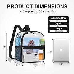Stadium Approved Size: Size for stadium events - 12" H x 11" L x 6" W, meets the clear bag policy of no larger than 12*12*6 inches, making it approved by stadiums,concerts, and sports events. Time-saving and Convenient: The clear backpack allows complete visibility all around.Pass through security with the see-through backpack to avoid being turned away at security checkpoints, and it's convenient to double-check that you have everything you need before leaving. Comfortable Design: The reinforced padded adjustable straps brings the soft-comfort for your all-day wear. The top handle is convenient whenever you want to carry your bag. The stylish design makes it a great accessory to fit your outfit and multi-color for you to choose. Durable Material: Small clear stadium backpack made of heavy duty PVC material which is thick, waterproof, sturdy, and well-made, Our clear backpack can ensure long-lasting durability. NOTE: Do not immerse it in water or expose it to heavy rain to avoid water getting through the zipper. Multi-Purpose Use: The clear small backpack stadium approved perfectly meets the requirements of concerts, festivals, security checks, sporting events, school, work,airports, etc. The stylish design is suitable for girls and women. It is also a great gift for family and friends. Recommended Age:The item is suitable for pepole over 3 years old.