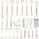 Umite Chef Silicone Kitchen Utensil Set, 34PCS Heat Resistant Kitchen Gadgets and Tools With Grater, Cream White Wood Handles for Nonstick Cookware