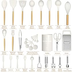 34PCS KITCHEN UTENSILS SET WITH HOLDER From the everyday kitchen spoons to the garlic crusher, This 34PCS kitchen utensils tools set included all the kitchen stuff you could possibly need to bring out your inner chef. This means you don’t have to spend extra money on repetitive utensil tools. This cooking utensils set includes a Slotted Spatula, Slotted Spoon, Turner, Pasta Server, Kitchen Tongs, Grater, Scissors, and so on. It is a great starter pack for a first apartment HEAT-RESISTANT, NON-MELTING-SOFT SILICONE One of the best things about Umite Chef silicone cooking utensils is their ability to withstand heat safely, each kitchen gadgetsl is heat-resistant up to a whopping 446°F and won’t melt (even leave it in the pot for a while) and our utensils head won't even become knicked or warped even at those extreme temperatures. The soft silicone won’t scratch non-stick cookware or your expensive pans VINTAGE WOODEN HANDLE -EASY TO CLEAN Each wooden handle is made of solid wood which is anti scalding. Smooth and comfortable to the touch, it completely prevents the heat transfer during the cooking process. Please note that each wooden handle has a slightly different color and texture. The one-piece design eliminates any gaps where food can get trapped, making cleaning a breeze. PLEASE NOTE that due to the wooden handle, We don't recommend soaking in water for a long time or dishwasher cleaning ODORLESS BPA-FREE, FOOD-GRADE SILICONE Each utensil is made of food-grade silicone, BPA-free, can use in any type of food. Stainless steel is wrapped inside to maintain its shape and flexibility, ensuring no warping. And it will not retain odors or colors like plastic kitchen utensils. ATTENTION Before the first use, the original smell will disappear after the silicone soaking in water and exposed it to the air for about 3 hours GREAT PRESENTS SET This kitchen utensil set comes with everything you need to get started cooking. A utensils holder can help you organized your kitchen tools well. If you moving or just need a new set of cooking utensils highly recommended. Perfect for house warming presents, wedding presents, mother's day presents, holiday presents and anyone else on your presents list