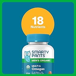Premium, Science-Backed Organic Gummy Multivitamin for Men: SmartyPants Organic Men’s Multi & Omegas is specifically formulated to help fill nutritional gaps in the average diet With Over 13 Nutrients to Support Busy Lifestyles*: Our science-backed formula includes vitamins A, D3, B12, methylated folate, zinc citrate, as well as vegetarian Omega-3 ALA all in a delicious serving Better Nutrient Sources: We include bioavailable forms of high-quality nutrients that are easy for your body to absorb like vitamin B12 as methylcobalamin, zinc citrate, vitamin D as D3, vitamin K2 as MK7, and methylated folate as methylfolate Certified Clean, Third Party Tested Formula: Our organic men’s vitamins are a Clean Label Project Purity Award Winner! Subjected to strict testing for 200+ contaminants and chemicals, so you can be sure you're choosing high quality vitamins you can trust Delicious Taste & Non-GMO: Raspberry, Orange, and Cherry Flavors with Other Natural Flavors. Adult men, take 4 gummies daily. May be taken with or without food