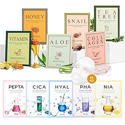 [ALL SKIN TYPE] 11 different type of masks focuses on a different skin concern to help boost radiance and support the skin. Masks are gentle enough to be used everyday, for hydrated and glow skin.(Made in Korea) [11 PACK INCULDED] Combo A (Vital facial mask pack: 5 Types) PHA, NIA, HYAL, PEPTA,CICA / Combo B (Essential facial mask sheet: 6 Types): Collagen, Honey, Vitamin, Aloe, Snail, Tea Tree. [CONCENTRATED ESSENCE] Excellent skin adhesion, prevents product evaporation to deliver the nutrition in the essence straight into your skin. Quality ingredients to hydrate, soothe, purify, and improve dullness of the skin. [SELF-CARE MUST HAVE] to pamper your skin and relax! There's no better way than to wind down at the end of a long day with a sheet mask! It's cooling material and nourishing essence can help your skin all while taking care of your skin! [BENEFIT] Each mask has their own specific benefit like, improving skin hydration, moisturizing dry and dehydrated skin, soothing & calming skin irritations, leaving your skin soft and smooth [HOW TO USE] Cleanse and tone your face. Unfold single use mask. Apply following the contours of your face, adjusting around eye and mouth area. Leave on for 10 - 20 minutes. Remove mask and gently pat face to absorb remaining essence into the skin