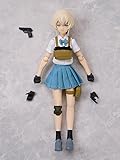 An import from Tomytec From the military high school girl Variant E has a short hairstyle, chest rig, and trail running shoes Standard figma size allows head part swaps with other figma characters, and the head and limbs attach with figma joints Set includes a 1/12-scale P230 type automatic pistol and an articulated figma stand