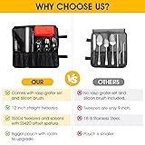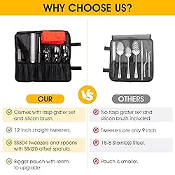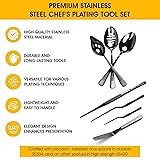 [Perfect for culinary plating] Upgrade your garde manger creations with our chef plating kit, expertly crafted for modernist cuisine at home. Our chef plating kit of essential culinary tools [High quality 304SUS chef equipment] Professional chef tools expertly crafted, our 3x chef tweezer tongs and 3x plating spoon ensures durability and precision in every single chef set. [Professional chef equipment ready to start] From the quenelle spoon to the plating tongs, our food plating tools also include pastry chef tools like our silicon basting brush and our hand grater set [Great Value] Our chef starter kit has 3x chef spoon ( 1x 7-7/8" rocher spoon, 1x 8" slotted spoon, 1x 8" saucing spoon), 3x pinzas de cocina para chef ( 1x 12" straight chef twizzer, 2x offset culinary tweezer tongs 6" & 9") & a 8" offset spatula [Amazing Add-Ons] Enhance your chef's tool box with our additional items: a versatile zester grater with handle and a silicone basting brush, perfect for all your culinary needs. [Easy Care] Easy and best to be hand-washed and to be dried after use. If the use of a dishwasher is required, please place tools into a utility mesh bag to minimise scratches and fading to the black oxide coating.