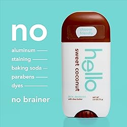 WHAT I’M GETTING: Includes three 2.6 oz deodorant sticks of hello Aluminum Free Deodorant for Men and Women, Lavender Vanilla, Sweet Coconut, and Unicorn ALUMINUM FREE PROTECTION: Free of aluminum, dyes, baking soda, and harsh chemicals NATURALLY SCENTED: The invigorating scents of creamy lavender vanilla, sweet coconut, and refreshing watermelon will leave your pits feeling magical 24-HOUR DEODORANT WITH SHEA BUTTER: Keeps odor at bay for a full 24 hours, so you can take on the day with confidence KNOW YOUR DEODORANT: Vegan and dermatologically tested