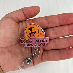 - "Sorry I'm Late I Saw A Dog Acrylic Badge Clip" Unique badge reel is not just an identification accessory; it's a source of companionship and inspiration. Each easy extension is a comforting experience, as if a close friend is providing you with steadfast support. With its simple yet creative design, it not only enhances your professional image but also brings a special sense of companionship to your everyday work. Gifts for Nurses: LEBEIGHT Nurse Badge Reel, the perfect accessory for nurses, doctors, and nursing students. Our retractable badge reels are not just functional, they also add a touch of fun and personality to your work outfit. As a nurse, you understand the importance of improving the mood of your patients and making a positive impact on their lives. Our cute and funny badge reels are a great way to start conversations with your patients and spread positivity. Personalized badge reels: Our badge reels are specifically designed for nurses, with a swivel base that ensures your ID card always hangs straight, no matter where you clip it. Our badge reels are retractable, making it easy to scan, swipe or read your ID card without having to remove it from your clothing. Plus, our badge reel accessories ensure that you can personalize your badge reel to suit your unique style and personality. So why settle for a plain and boring badge reel when you can have one that's both functional and fun? Got LEBEIGHT Nurse Badge Reel and add a touch of personality to your workday.