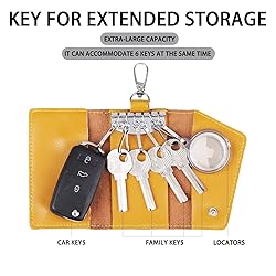 Large capacity:Holds up to 6 keys and 1 split key ring for access card, which is useful and convenient for user to carry his/her keys. Slip-in pocket slots where you can put ID cards,Bank card,Credit card Material: Soft cowhide leather with high-quality silver hardware Multi-function key fob: This leather key organizer makes it easy to pack multiple keys in one compact, stylish accessory, including home keys, car keys... Detailed list:a key bag,six 0.8-in keyrings,a protective cover of airtag Family gifts:Hanging style. A zinc alloy buckle for hanging with your trousers, very convenient. The best gift to you and for your family