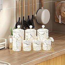 - Description: - 【Multipurpose】: The 7 compartment divided serving platters is suitable for storing snacks, nuts, candies, cookies, desserts, dry spice ect. (210ml and 750ml) - 【Material】: Appetizer serving tray is made of quality smooth porcelain material, marble texture, glazed, fine workmanship, practical and elegant. - 【Practical】: Snack dishes have tray that with double handles, which are easy to move and take. Each jar has a cute cover, which can effectively prevent dust. - 【Easy to Clean】: Dried fruit plate is easy to clean, just clean it with clean water or wipe it with a damp cloth. - 【Application】: serving dishes are suitable for home, kitchen, living room, reception room, restaurant, party, office and other occasions. Specification: - Material : porcelain Size Chart: 750ml Serving Jar: 20cmx10.5cm/7.87inchx4.13inch 210ml Serving Jar: 12.5cmx7.5cm/4.92inchx2.95inch Storage Rack: 38.5cmx20cmx12cm/15.16inchx7.87inchx4.72inch Package Includes: 1 Set Dried Fruit Plates (3 Large Jars, 4 Small Jars, 1 Storage Tray)