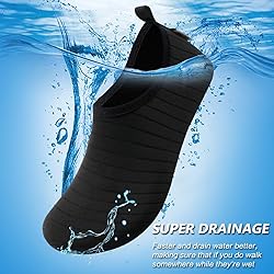 Recommended 1: CONVENIENCE - Smooth neck design prevents chafing when wearing our water shoes. It is convenient to wear and take off. Recommended 2: COMFORTABLE FIT -- Breathable and smooth fabrics with fine stretch on uppers. Like socks, flexible and comfortable. Recommended 3: RUBBER OUTSOLE & FOOT SAFETY -- Wearable and top-quality rubber sole, which protects your feet from being hurt by sharp objects. Recommended 4: OCCASION - Yoga Training, beach, swimming, pool, weight training, wake-boarding, sailing, boating, kayaking, windsurfing, cycling, jogging, walking, fishing, beach volleyball, gardening, lawn, car-washing and driving. Family outings! Tips:VARIOUS SIZE AVAILABLE -- fit different feet,little kids, big kids,men,women are available.