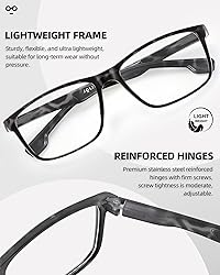 Effectively Reduce Eye Strain: Our reading glasses for men with magnification strengths ranging from 0.00 to +4.00 are designed to help reduce eye strain caused by digital screens, offering protection against harmful blue light and minimizing discomfort during prolonged use. Anti-Reflective and Scratch-Resistant Lenses: Featuring lenses that are both anti-reflective and scratch-resistant, our reading glasses provide clear vision and effectively block out harmful rays, ensuring a comfortable viewing experience for magnifications including +1.00, +1.25, +1.50, +1.75, +2.00, +2.25, +2.50, +2.75, +3.00, +3.25, +3.50, +3.75, and +4.00. Suitable for Various Activities: Whether reading in bed, using digital devices, or engaging in other activities, our readers for men with multiple magnification options are versatile and suitable for extended wear, offering comfort and protection throughout the day. Effective Blue Light Blocking: Our mens reading glasses are designed to effectively block blue light, aiding in reducing eye fatigue, minimizing headaches, and promoting better sleep quality, especially during digital device use. Durable and Comfortable Design: With durable frames and comfortable features such as spring hinges and ergonomic design, our reading glasses men are built to last, offering a secure fit for different face shapes and ensuring long-term comfort during wear.