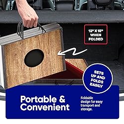 DURABLE WOODEN BOARDS: Crafted from high-quality engineered wood boards ensuring durability. The FLINGSPORT cornhole set features foldable legs crafted from sturdy plastic, designed to withstand damp grass. For added durability, we've reinforced the corners with plastic protectors, ensuring long-lasting performance. IT IS NOT WATER PROOF! EMBRACE AMERICAN HERITAGE: Immerse yourself in nostalgia with our cornhole boards, meticulously crafted to replicate the timeless appeal of vintage steel-framed barn wood planks. Perfect yard games for gatherings with friends and family, these corn hole boards add a touch of rustic charm to any outdoor games, inviting players of all ages to enjoy a classic American pastime PORTABLE CORNHOLE SET: Our foldable cornhole boards are designed for easy transportation, whether you're on a vacation, road trip, or enjoying a game at home. Featuring a compact design that folds into 15 in x 12 in, they easily fit into any space. Plus, they come with a handy carrying bag for easy storage and transport, ensuring fun on the go or in your backyard. CORNHOLE SET INCLUDES: Two 24 x15 inch MDF wood cornhole boards, a carrying bag, and eight 7 oz bean bags (4 red & 4 blue) with a pouch, ensuring smooth tossing. Crafted from thick canvas material with double-sided stitching, the bean bags offer enhanced durability for long-lasting enjoyment. BACKED BY US: Enjoy peace of mind with the FLINGSPORT cornhole game set. We offer a 90-day warranty. Please reach out to us anytime - your satisfaction is our priority!