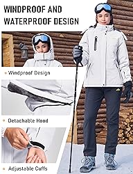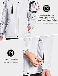 Windproof & Waterproof: Professional waterproof coating, waterproof rating up to 10000mm/H2O, skiing, snowboarding or rainy days don't have to worry about getting wet, our waterproof raincoat will protect you effectively in all aspects, keep you dry and warm all day long, and also fight against bad rain and foggy weather Warm Fleece: Winter jackets for women is made of polyester fiber. Warm, insulated Windproof, Waterproof, soft and comfortable. Fleece lined jacket and fleece detachable hood makes great heat retention. keeping you warm in cold weather winter outdoor 5 Utility Pockets: 2 zippered hand pockets, 1 zippered chest pocket, 1 zippered arm pocket 1 zippered chest pocket inside, all with waterproof zippers, suitable for cell phones, ski passes, wallets, passports and other accessories Adjustable Cuffs & Detachable Hood: Detachable hood, Adjustable Drawstring, adjustable cuffs, stand collar and full zipper closure, all with wind protection add extra warmth protection to your winter travels Occasions: Ski jackets with excellent waterproof is perfect choice for all winter activities. Such as skiing, climbing, hiking, cycling, trekking, daily casual wear, mountaineering, snowboarding, tourism, camping and other outdoor winter activities