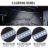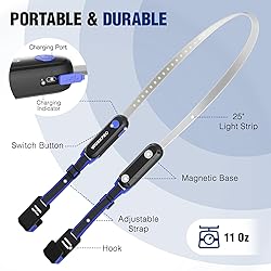 Ultra-Long Light Strip & Three Modes: This led work light features a 25-inch ultra-long light strip with 50 high-brightness LEDs, providing a wide and even illumination. It offers three brightness levels—high, medium, and low—to adapt to various scenarios. Whether for night work, outdoor repairs, or emergency lighting, it delivers a stable and efficient light source, helping you tackle any challenge with ease Fast Charging & Long-Lasting Battery: This rechargeable LED work light has a 2200mAh battery and is equipped with a USB-C port and dual charging ports for fast charging. The LED indicator clearly shows the charging status - red when charging and green when fully charged. It can run continuously for up to 3.5 hours in high mode, 7 hours in medium mode, and 13 hours in low mode, ensuring long-lasting and reliable lighting for long-term use Strong Magnetic Base & Hook: This magnetic flashlight features a dual strong magnet and hook design, allowing it to securely attach to metal surfaces like car hoods or hang effortlessly in non-metal areas. The built-in magnetic base ensures stable positioning, while the dual hooks further enhance stability, freeing your hands to focus on tasks Adjustable Elastic Strap: This magnetic work light comes with an adjustable elastic strap, made from high-quality, wear-resistant nylon for high elasticity and exceptional durability. It resists loosening or breaking even with long-term use. Designed to fit car hoods ranging from 52 to 75 inches in width, it securely adapts to different vehicle models, ensuring safe and stable installation in various applications Easy to Store & Wide Applications: This underhood work light weighs only 0.69 pounds. With a slim and lightweight design, it eliminates the hassle of bulky mechanical work lights. Its foldable structure saves space when not in use. It is safe to use in a variety of environments and is a great choice for home, basement, construction site, workshop, garage and car trunk