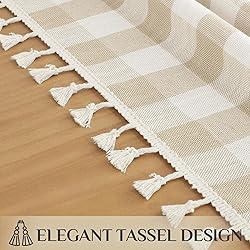 CLASSIC GINGHAM TABLECLOTH WITH TASSELS: Featuring the timeless beige and white buffalo check pattern with playful tassel fringe, this tablecloth for 6 foot rectangle tables blends rustic, farmhouse charm and modern elegance to create a cozy, inviting dining atmosphere. PREMIUM FABRIC AND CRAFTSMANSHIP: Made from soft, luxurious linen cotton, this plaid tablecloth is non-slip, wrinkle-resistant, and highly durable. It effectively protects your table while offering a beautiful drape for an elegant and polished look. BEST DECOR: This beige and white checked tablecloth with tassels is perfect for both everyday use and special occasions. It can be used indoors in the kitchen, dining room, or living room, or outdoors for weddings, spring parties, picnics, and barbecues. A great gift to enhance any space. SIZE CHOICES: Each package includes 1 table cloth for 6 foot rectangle tables measuring 55" W by 84" L. The tablecloth is typically larger than your table size, so it's recommended to add at least 20 inches to the length of your table (10 inches on each side) for a better drape effect. EASY TO CARE: Machine washable or wipe clean with a damp cloth. Made from medium-weight, durable cotton-linen, this tablecloth is fade-resistant, shrink-resistant, wrinkle-free, and pill-free. The tassels remain intact even after washing.Note: The material tag on this tablecloth incorrectly says "100% Polyester. It is actually a polyester-cotton blend.