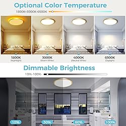 【Soft Night Light for Improved Sleep】This stylish ceiling light features a soft 1800K amber night light mode with a backlit soft glow that creates a warm ambiance to help you relax and sleep soundly. In addition, the 60-minute timer allows you to enjoy the soft light before bedtime without having to turn it off afterward 【Adjustable Color Temperature and 10-100% Easy Dimming】The color temperature of this LED fixture can be adjusted to 3000K Warm White, 4000K Natural White, and 6500K Cool White, and the dimming function provides 10-100% control of the brightness to ensure the best lighting effect. You can adjust the light intensity as needed, making it perfect for creating different moods and atmospheres 【Convenient Remote Control & Memory Function】This flush mount light fixture comes with a convenient remote, allowing you to effortlessly adjust brightness, color temperature, and night light settings. Plus, the built-in memory function saves your preferred settings for one-touch access 【Easy Installation, Safe and Reliable】This light fixture powered by 120 voltage is designed for easy setup with all necessary hardware and clear instructions included. The fire-resistant plastic housing provides added safety and protection against electrical hazards 【Bright, Long-lasting, and Energy-saving】This modern flat ceiling light provides 2400 lumens of brilliant illumination with high-quality LEDs that last over 30,000 hours, saving you money and energy.This dimmable ceiling light fixture comes with a remote for effortless brightness adjustment and is suitable for rooms ranging from 160-269 ft². Perfect for livingrooms, dining areas, kids room and more 【High CRI & Wide Application】With a high CRI (80+), this LED ceiling light creates a vivid and natural environment by rendering colors accurately and providing even, glare-free illumination.We're dedicated to your satisfaction and are here to assist you every step of the way. Contact us with any questions.