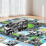Police Trucks Toys Set with Play Mat - Includes 1 Police carrier truck with sounds and lights, 1 ambulance, 1 ladder truck, 1 lifting truck, 1 water cannon vehicle, 1 ambulance, 1 armored car, traffic signs and play mat. Police Truck Toys for 3 4 5 6 Years Old Boys – The truck features authentic sound and lighting effects; Through the 4 buttons on the top of the truck, your child can see cool lights, pleasant music, and hear the sound of the vehicle starting, a whistle, an alarm. Awesome gift for birthday, festivals and holidays. Police Vehicles Model - Small truck made of Alloy metal Material and Plastic ABS. Kids can do all kinds of construction job with the vehicles. Great for develops kids finger skills and early preschool education development. City Theme Activity Play Mat - This carpet is made of non-woven fabrics instead of thin PVC. Mat size is 32 "X 27", it is large enough for 2-3 kids to play. Great for promoting friends interaction & parent-child bond. Perfect Gift for Kids – It will be a great gift for kids who love car toys. Best gifts for 3 4 5 6 7 8+ year old boys girls kids, birthday cake decoration, Christmas gifts, Thanksgiving gifts, Easter gifts, birthday gifts, and party favors!