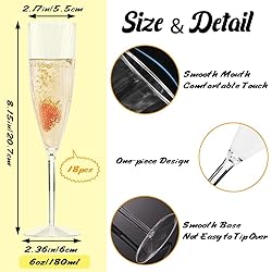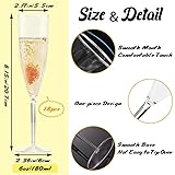 - Clear Plastic Champagne Flutes, 6OZ/180ML Disposable Wine Glasses, Reusable Cocktail Cups for Home Daily Life Party Wedding Toasting Drinking Sturdy and Durable The disposable wine glasses are sturdy and easy to hold, ensuring you have a comfortable grip while enjoying your wine. High-temperature disposable injection molding process makes the cups thickened and hardened, not easy to deform, no leakage, more durable. Multiple Uses The plastic champagne cups can be used to hold not only champagne, but also a variety of your favorite beverages such as Bloody Marys, cocktails, sodas, and more. Their lightweight and portability makes them ideal for outdoor events and parties! Easy to Clean The plastic wine glasses can be easily hand washed and reused despite being a disposable product. The cups are sturdy and durable, not easily deformed, and the mouths of the cups are smoothly finished, making the cleaning process simple and quick. Moreover, thanks to the high transparency of the material, you can clearly see the cleaning results and ensure that there is no residue left behind. Wide Application With its noble and elegant design and moderate capacity of 6 ounces, the plastic champagne flute is an ideal choice for weddings, birthday parties, celebrations and other occasions. Whether you're raising a glass to celebrate or savoring a drink, it adds a touch of elegance and convenience to the event. Compared with disposable paper or glass cups, champagne flutes disposable are more resource-efficient in terms of material and process. Their durability and recyclability make for a more rational use of resources. Specifications: Size: 8.1 x 2.4 x 2.2in/20.7 x 6 x 5.5cm Capacity:6oz/180ml Material: PS plastic Color: transparent Package Includes: 24 x disposable plastic champagne glasses