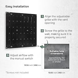 FITS STANDARD 11" x 11” OPENINGS – Fits no more than 11.34" x 11.34" Inch standard rectangular wall or ceiling cutouts, ensuring smooth airflow and a precise, secure fit in residential or commercial installations. SCRATCH RESISTANT METAL CONSTRUCTION – Made from heavy-duty steel with RAL9016 polymer coating that resists corrosion, scratches and deformation. Durable finish provides lasting protection against wear, temperature changes, and everyday use indoors or outdoors. BUILT-IN MESH AND ADJUSTABLE AIR FLOW – Integrated fine metal mesh prevents dust, debris, and small particles from entering the ventilation system. Equipped with a manual regulator, allowing you to fine-tune air volume and direction. EASY WALL OR CEILING MOUNT – Pre-drilled holes allow for quick, secure installation using standard screws. Can be mounted horizontally or vertically to suit any HVAC layout. (SCREWS ARE NOT INCLUDED) INDOOR AND OUTDOOR USE – Ideal for bathrooms, kitchens, garages, or utility rooms. Provides effective air circulation and modern appearance, supporting both intake and exhaust ventilation applications.