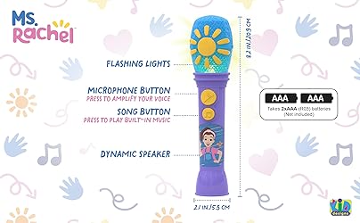 - Learn and grow together with the Ms. Rachel Sing Along Microphone! Designed for children aged 18 months and up, this toy microphone has easy to use, toddler-friendly controls. Press the Song Button to play 3 built-in songs: ‘Wheels on the Bus’, Old MacDonald’, and ‘I’m So Happy’. Press and hold the Microphone Button to amplify your voice as you sing along, while an LED light show pulses along to the music. Featuring cute graphics inspired by Ms. Rachel, this microphone toy makes a great gift for your little one. Visit the ekids brand store to explore even more cool toddler toys!