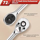 【Detail size】: The 1/4" socket set 101 Piece includes 26PCS shallow and deep metric socket: 4, 4.5, 5, 5.5, 6, 7, 8, 9, 10, 11, 12, 13, 14; 22PCS shallow and deep SAE socket: 5/32, 3/16, 7/32, 1/4, 9/32, 5/16, 11/32, 3/8, 7/16, 1/2, 9/16; 1PCS 1/4 72 teeth ratchet handle, 1PCS Spinner Handle, 2PCS extension bar: 3", 6"; 1PCS power drill adapter, 1PCS 1/4 360° universal joint; 1/4 bit adapter, 30PCS bits, 1/4 bit ratchet, 16PCS Metric and SAE allen wrenches. 【Material processing】: 101pcs SAE/metric socket set 1/4 inch drive made of heat treated Chrome Vanadium Steel (CR-V), keeps durability and extreme torque strength. The chrome polished surface makes socket set longer life and maximum corrosion resistance, grease or stain can easily cleaned on it. Lettering marks are convenient for you to identify metric SAE sockets quickly even in low-light conditions. 【6-Point Socket Design】: This mechanic tool kit features a 6-point flank drive design that provides a secure grip on fasteners while preventing damage to their corners, effectively minimizing the risk of rounding. It comes with 3", 6" extension bars and 360° universal joint that allows access to narrow area and flexibly change angle. Saving time and labor for more efficient. 【Organized Storage】: This ratchet wrench socket set comes with a Wear-resistant tool box, all sockets are neatly fixed in the box for easy carrying, transportation, safe storage, and quick organization that make you take 1/4 drive socket set anywhere to meet your job requirements, working efficiency. 【Multi-purpose】: 1/4 standard and deep socket set is able to satisfy various maintenance demands of home improvement, car repair, vehicle repair and mechanism, other DIY projects. Value gift for men on various occasions like Father's Day, Birthday or anniversary.